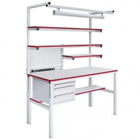 Модульная система дает возможность оснастить стол дополнительными элементами: подвесными тумбами, перфорированными панелями, электропанелями, планками для лотков, верхними и нижними приборными полками, освещением рабочей зоны, угловыми секциями, крючками для инструментов и другим профильным оснащением.