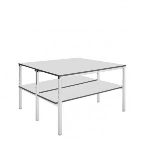 Базой стола служит мощный металлический профиль, способный без деформаций выдерживать серьезные нагрузки вплоть до 300 кг. Металл обработан износостойким порошковым полимером, при этом цвет покрытия можно подобрать из нескольких доступных вариантов. И главная рабочая поверхность, и нижний ярус изготовлены из прочной ламинированной плиты (ЛДСП) толщиной 25 мм, что гарантирует идеально ровную плоскость для кроя.